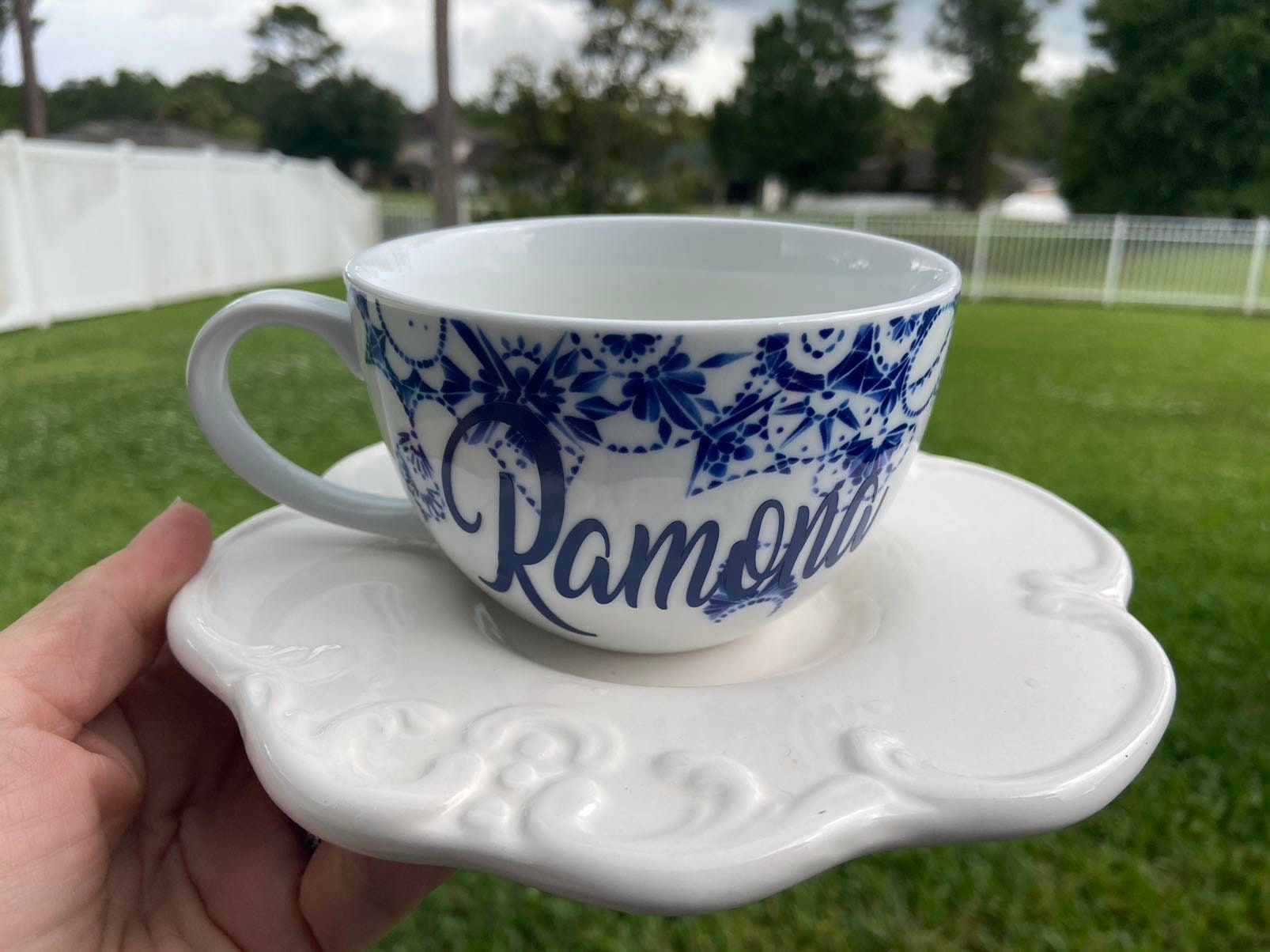 Personalized with name of choose. Lettering is created with outdoor grade vinyl. Vinyl holds up to water and heat. Dishwasher instructions will be sent before shipping.