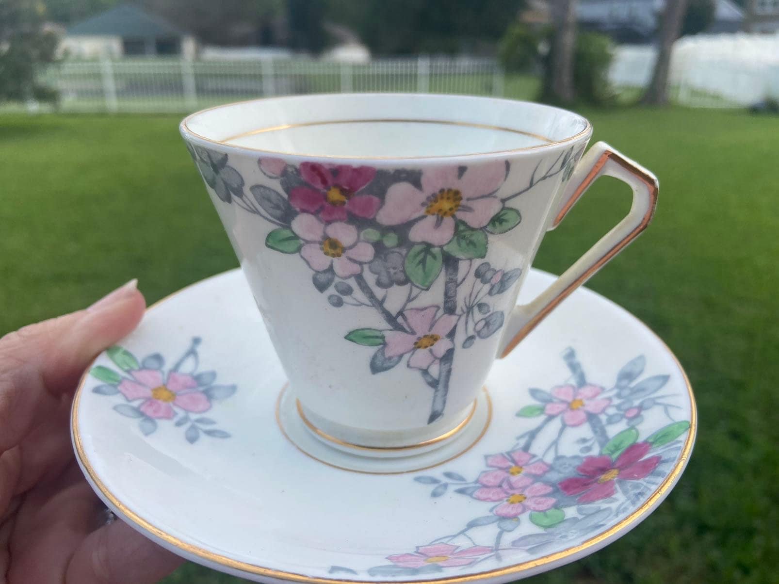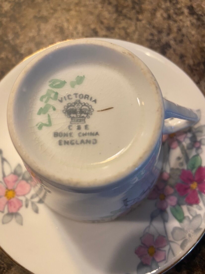 Photos speak 1000 words. This Victoria vintage tea cup and saucer has beautiful flowers and the saucer compliments this set with flowers.