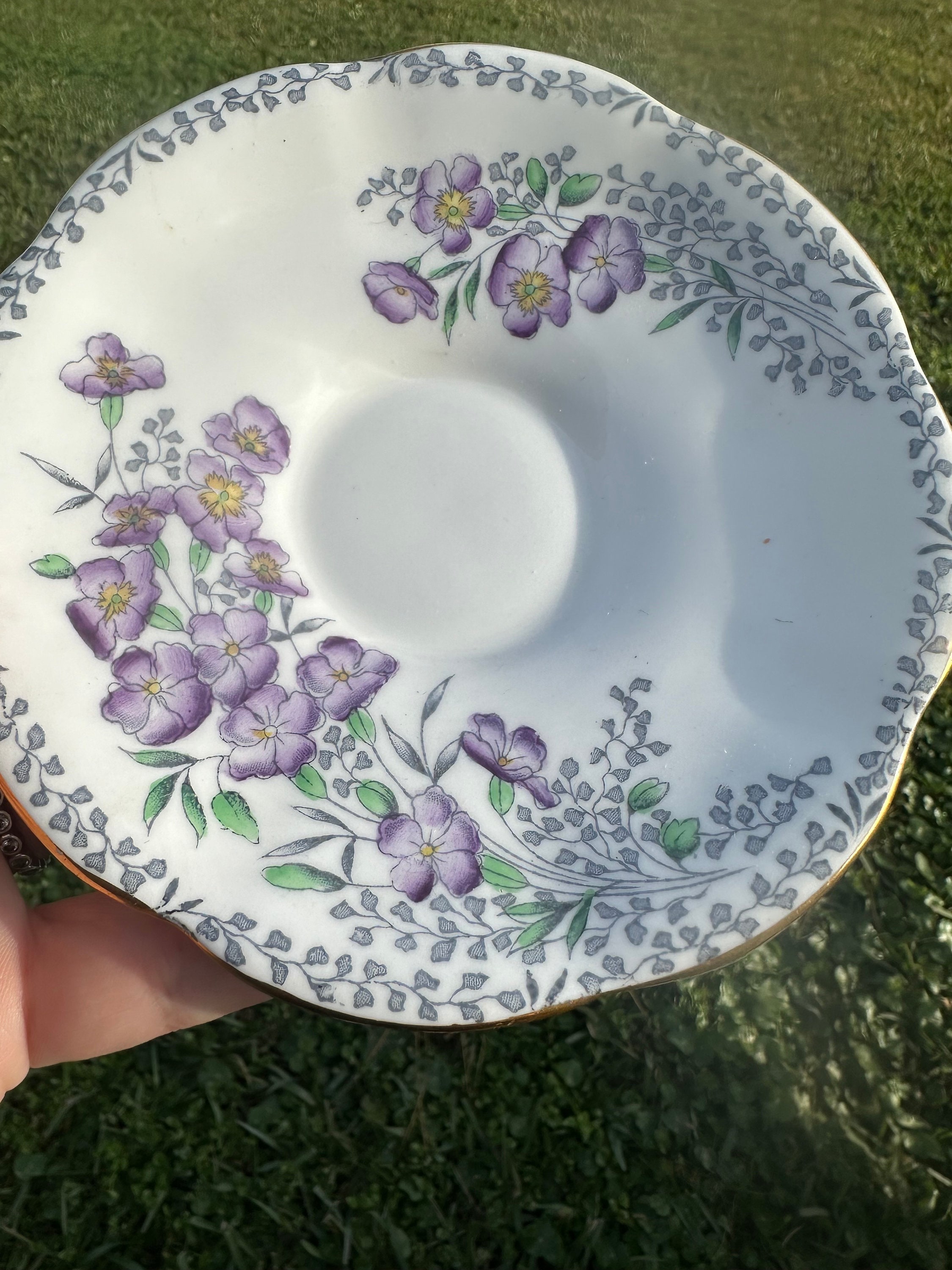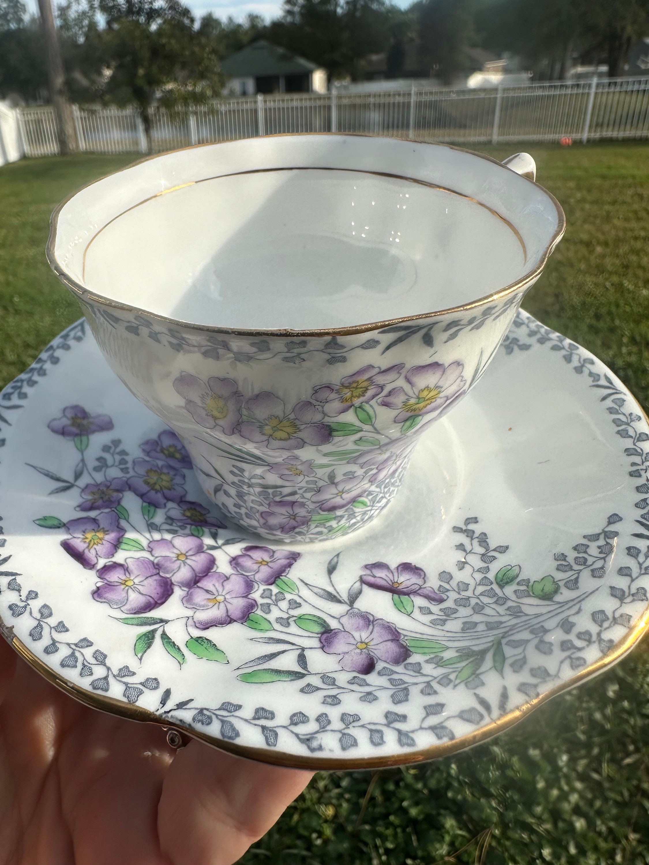 Super rare teacup set. Rosina English Teacup and Saucer Set. Beautiful purple pansy design on the saucer with greenery.
