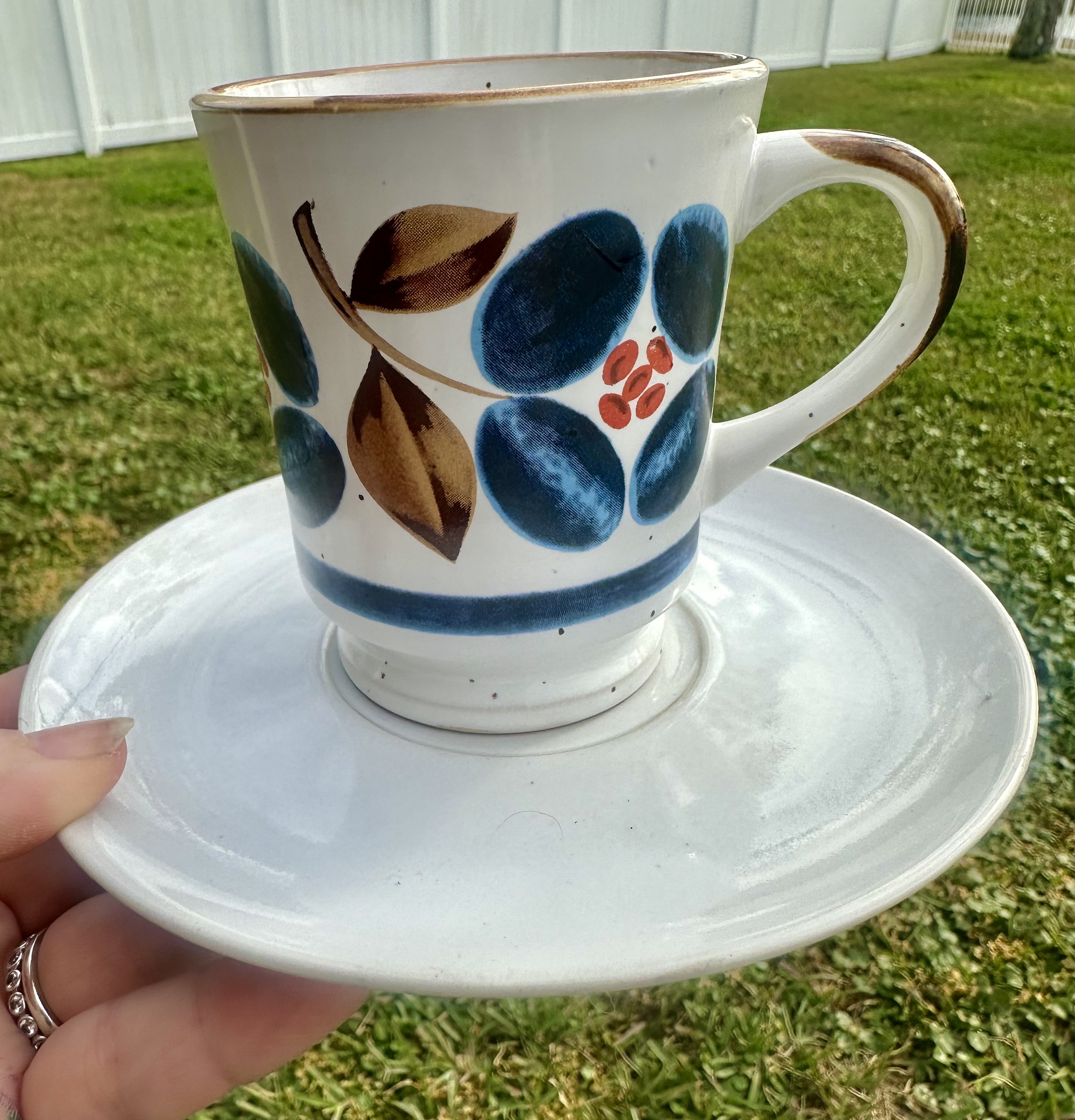 These listing includes a 12oz Coffee Cup that is bone white. with beautiful retro flower design. Saucer is bone white.