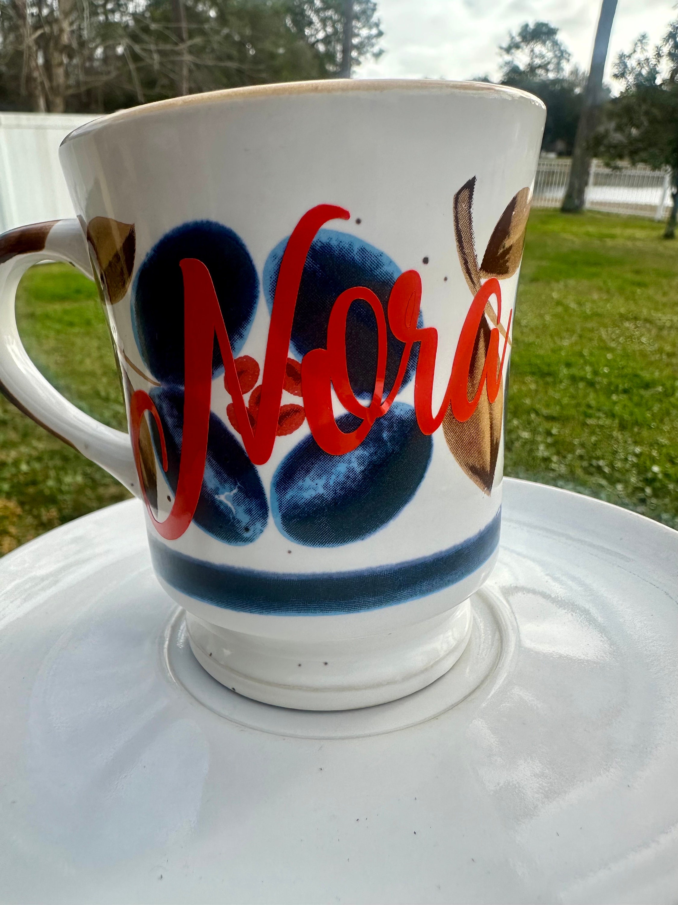 Each set includes a name of your choice. Name is on the cup and saucer. Name is made with vinyl lettering that is outdoor grade and is top shelf safe in the dishwasher with warm water and soft detergent.